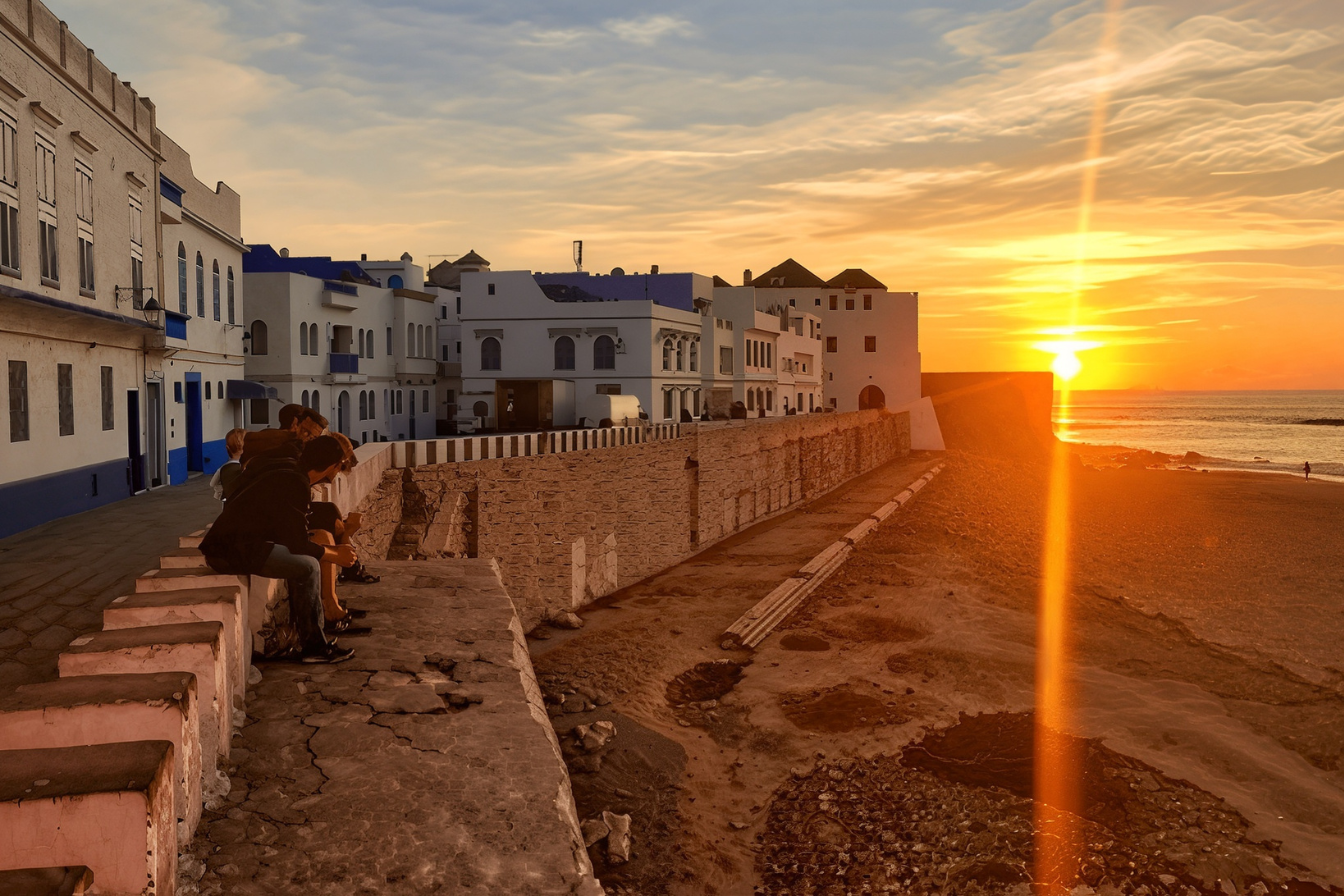 Installe-toi face à l’océan et laisse la magie opérer : à Asilah, le soleil embrase les murs blancs et l’horizon doré pour un moment suspendu entre mer, lumière et calme absolu.